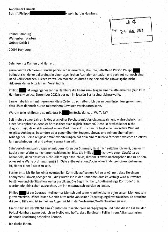 Der verliehene Heiligenschein für Andy Grote übersieht dabei, dass diese Forderung bereits seit dem 1. April 2023 im Waffengesetz reguliert ist für alle Personen unter 25 Jahren und für auffällige Zeitgenossen. Und er übersieht, dass solche „Gutachten“ ohnehin lediglich eine Momentaufnahme darstellt und demnach keinerlei praktischen Sinn bedeuten, wie mit diesem Thema befasste Fachpsychologen gegenüber dem Autor ausdrücklich bekunden. Christian Graf zu Bentheim, der solche Überprüfungen bereits seit Jahren durchführt: „Bereits in kurzer Zeit kann sich ein Mensch derart verändern, dass ein solches Papier vollkommen wertlos wäre. Besser wäre es, hier bei einem tatsächlich erkannten Bedarf solche Prüfungen vornehmen zu lassen und nicht einfach Statistiken zu füllen.“