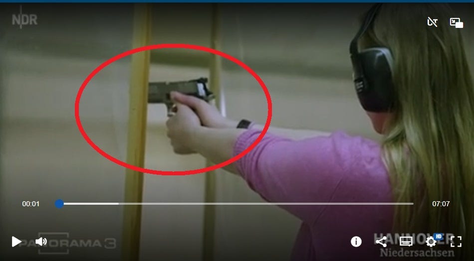 Die Autorin hatte sich zum Verein für Freihandschießen 1862 e.V. in Hannover begeben, einem „traditionellen Schützenverein“, wie bekundet wird. Dort schießt sie vor der Kamera zum ersten Mal mit einer Großkaliberpistole im Kaliber 9mm, gezeigt wird sie beim Verwenden einer SIG Sauer X-Six aus der Modellreihe P226. Der Schießstand ist ein moderner Kurzwaffenstand und auch die Pistole ist nur wenig Traditionell, es ist die aktuelle Sportversion des Herstellers. Die ersten Schüsse als Gast gibt die Journalistin statisch ab, auf 25 Meter und die Ringscheibe, also genau so, wie es auch üblich ist.
