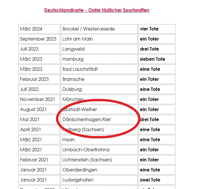 Ein Blick in diese Liste der Initiative „Keine Mordwaffen als Sportwaffen“ zeigt allerdings, dass es mit dem Wahrheitsgehalt dieser Behauptungen nicht nur nicht sonderlich weit her ist, ganz offensichtlich widerspricht sie sogar den eigenen Berichterstattungen des NDR selbst, sind darin doch Fälle wie der Dreifachmord von Dänischenhagen und Kiel im Mai 2021 aufgeführt, der mit einer illegalen Maschinenpistole Uzi und einer schallgedämpften Pistole Walther PPK verübt wurden, die ebenfalls niemals in Erlaubnisdokumenten eingetragen war. Dazu hatte die ARD sogar am 22. Februar 2022 selbst eine Pressemitteilung herausgegeben. Entweder hatte also niemand die Quelle geprüft oder aber es war schlicht egal, ob die gezeigte Liste überhaupt stimmen würde.